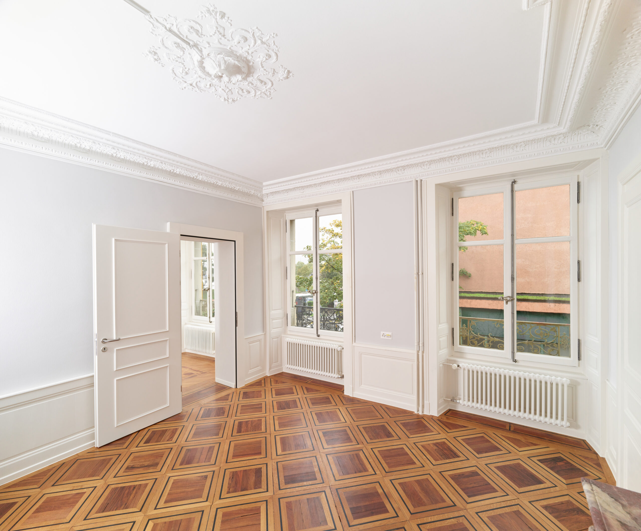 Dans les chambres, le salon, le couloir et le hall, un parquet en chêne avec une finition d'usine a été installé, offrant une sensation de chaleur et d'élégance. Pour les salles de bains, la cuisine et les toilettes, des carreaux combinent praticité et esthétique.